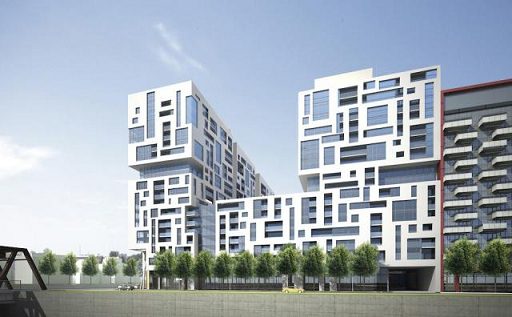 “Reve” is the red building in the centre of the first photo, and the new Minto/Freed project is the white building with the trees in the forgeround: