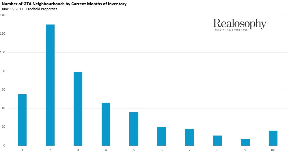 The GTA as a whole may still be a seller’s market (with 1.81 months of inventory as of May). However, as John Pasalis of Realosophy points out, there are communities (especially in the 905) with seven to ten months of inventory – well into buyer’s market territory.