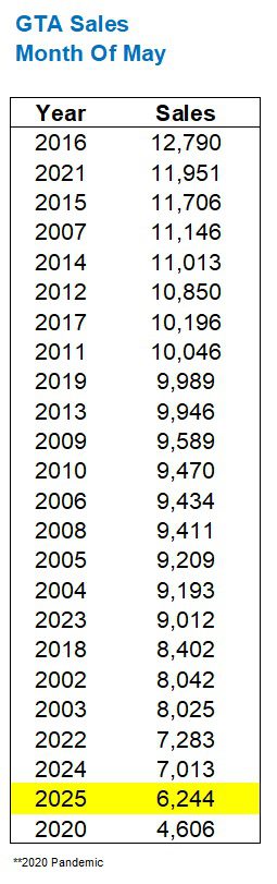 The average GTA home price, as of May, 2025, is down by 16.0% since the peak in February of 2022.