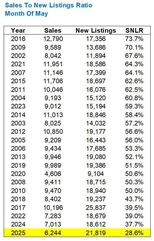 All told, we saw the fewest sales in May and the second-most new listings in May, which is going to provide for an all-time low absorption rate, or sales-to-new-listings ratio.