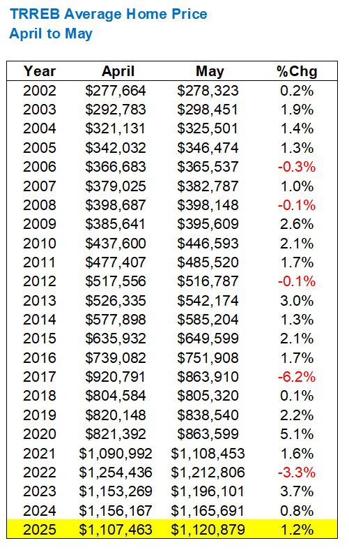 The GTA average home price increased by 1.2%, month-over-month, from $1,107,463 in April to $1,120879 in May.