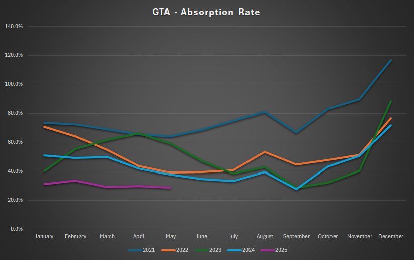 For those playing along at home, this means we’ve hit a new 2025-low for the absorption rate, with that 28.6% figure just coming in below March’s 29.0%: