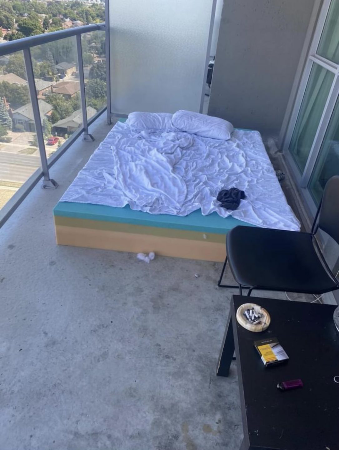 The outdoor bed is more sad than it is funny. Sign of the times.