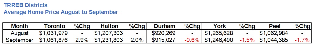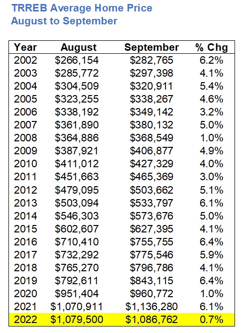 My flip-flop doesn’t really qualify me to say that I was right about anything, however, the TRREB average home price did uptick slightly, from $1,079,500 in August to $1,086,762 in September.