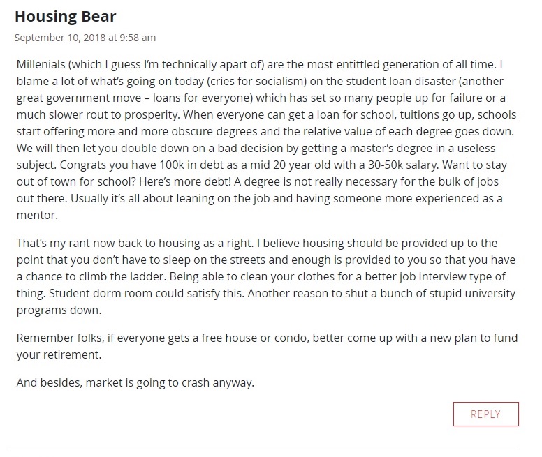 And the more people who protest “high real estate prices,” the less the conversation remains on things the government actually can, and should be focusing on, like building affordable housing, and trying to direct the private sector toward building rentals instead of condos.