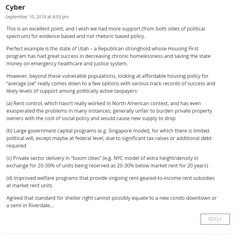 Beyond that, my opinion would start to veer from those of many. I don’t believe that those who are looking to the government for free, or subsidized housing, have any right to demand where it is. We would all like to live in Toronto, if we had a choice. But is that a right? I’m not so sure.