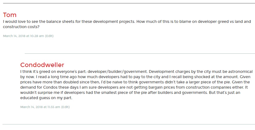 For those out there that believe “developer greed” is driving real estate prices in new construction, think again. It’s the easy answer, like blaming nameless, faceless, foreign buyers for higher real estate prices in 2016 and 2017. Perhaps it’s time we really look at just how fat the City of Toronto has gotten from sucking at the real estate teet for so long? I can’t wait to see them complain about how their “revenue” from land transfer tax is down in 2018, but that’s another story…