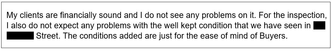 I emailed all the agents that showed the property with VERY specific instructions, outlining that offers would be reviewed at 6:00pm sharp and that agents were to register their offer by no later than 5:00pm, “To ensure all agents presenting an offer at 6:00pm were informed as to the number of competing offers.”