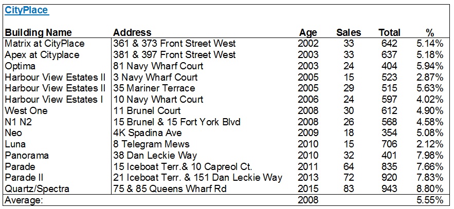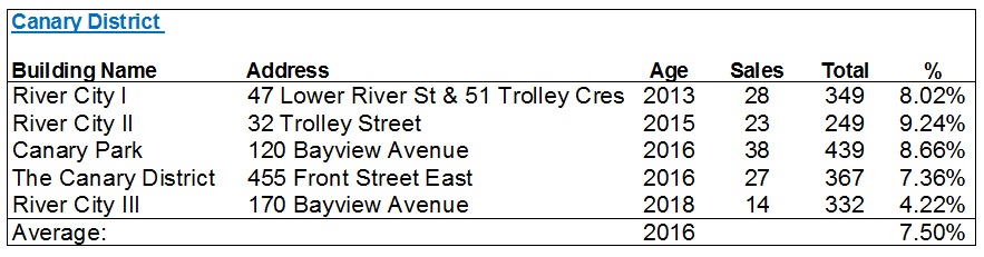 Then comes the Canary District, which for those of you who don’t know, is down at Front Street & River Street. This is where the athletes village was for the Pan Am Games, and while there are a few dedicated rental buildings, these are the five condos in the area: