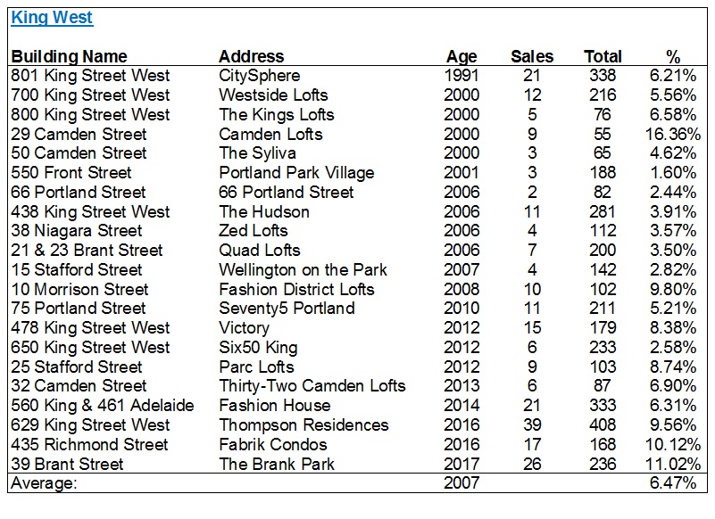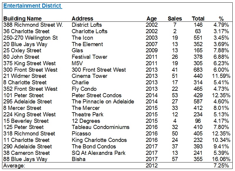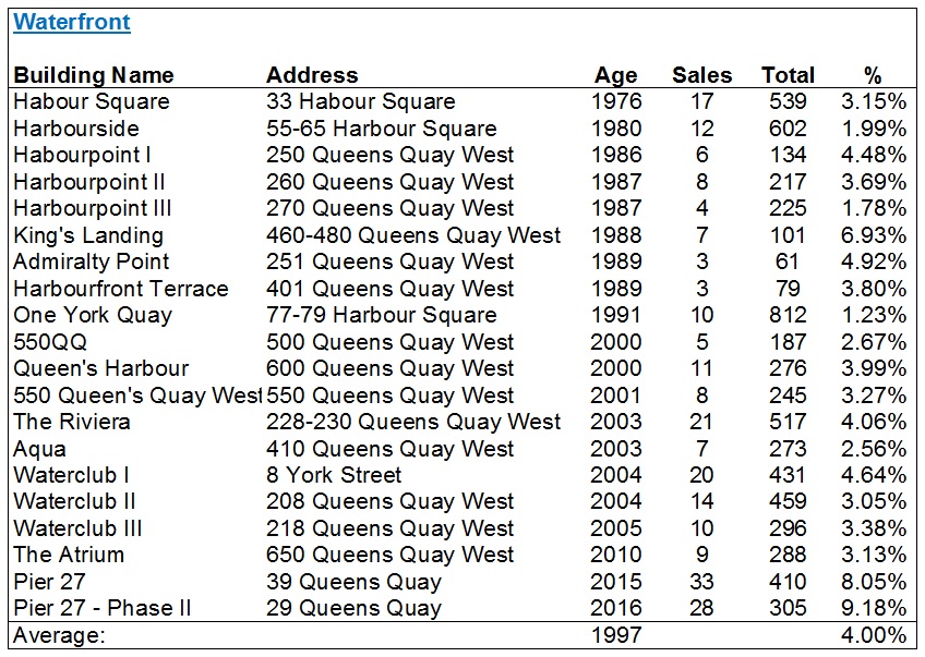 I should mention at this point – any building which was registered in 2018 was not used in these lists. I wanted to ensure there’s a fully 12 months of data, and there were a couple of buildings in Canary District, Regent Park, King West et al that didn’t make the lists for this reason.