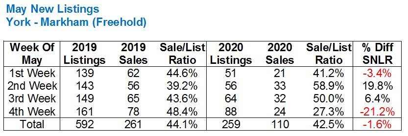 Aside from downtown Toronto condos, which are only down 16.1% in terms of new listings in the first four weeks of May, most areas are down by about half.